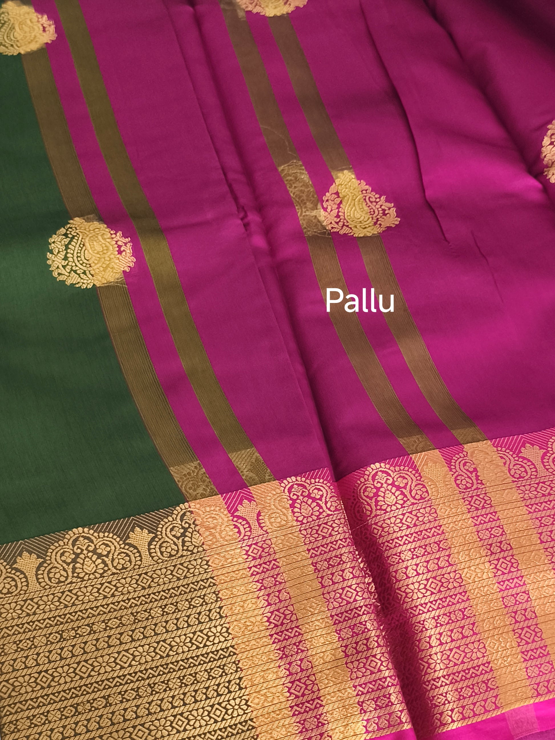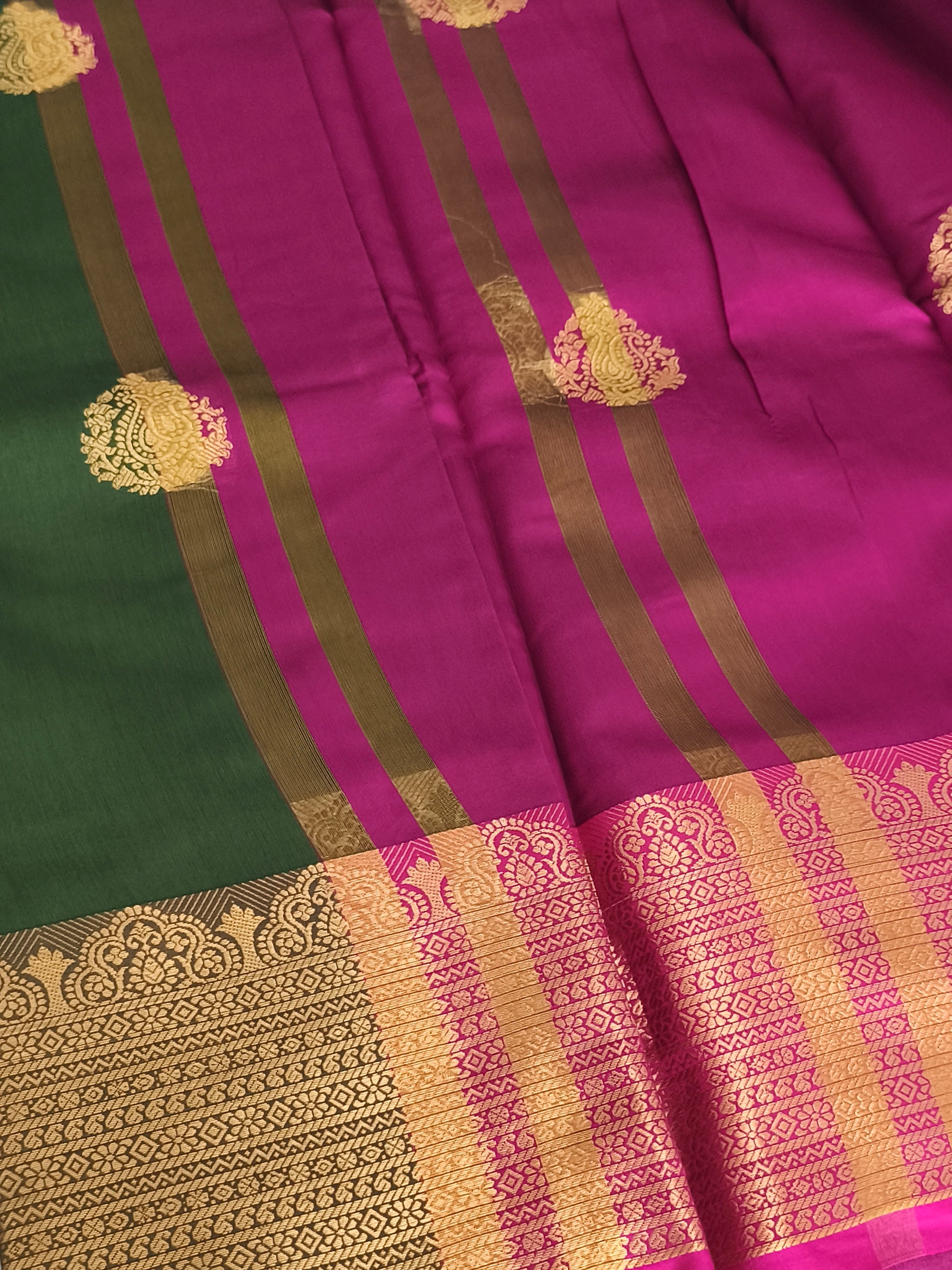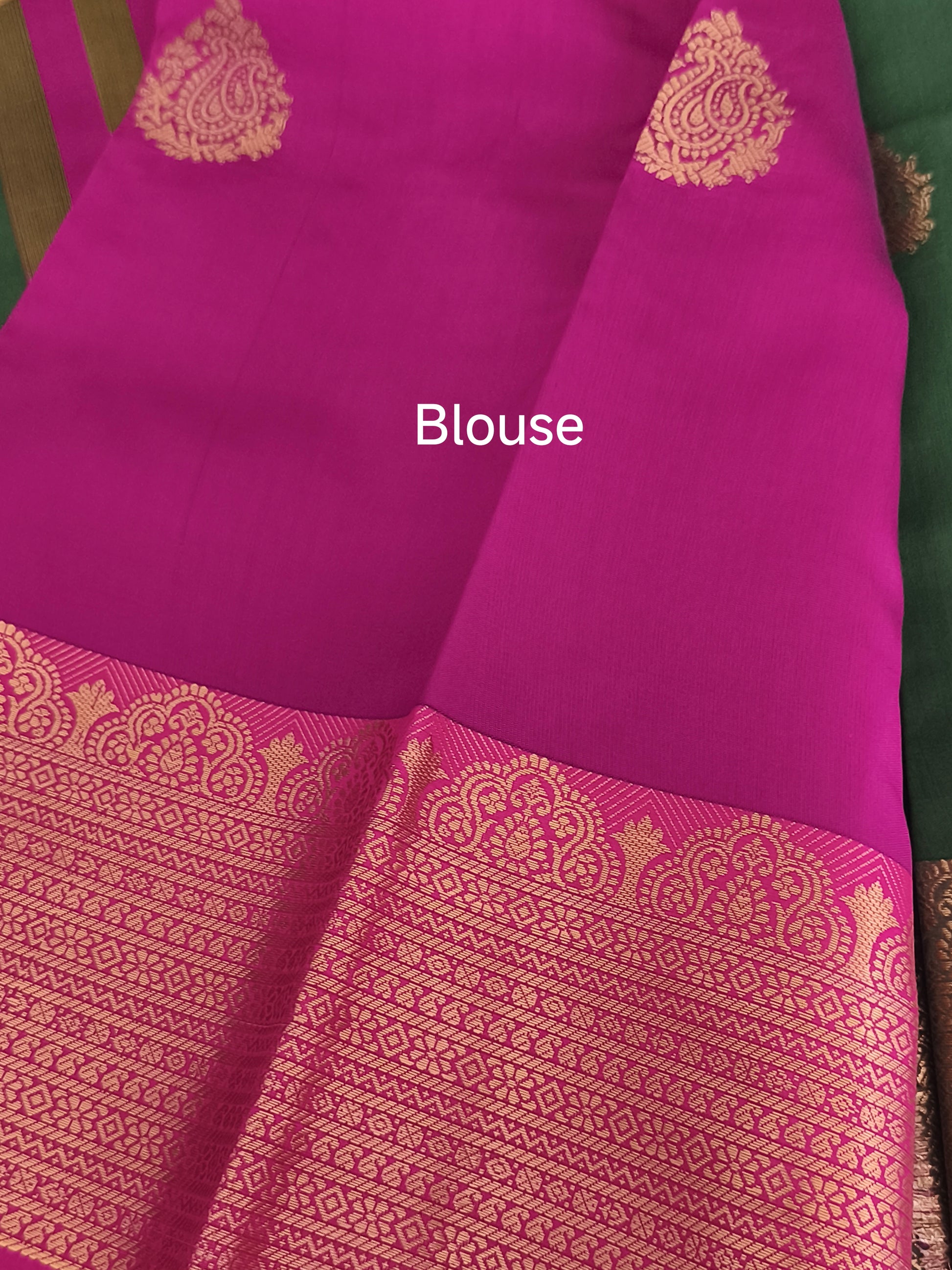 Beautiful trendy kanchi Semi soft silk saree with contrast blouse and rich pallu.