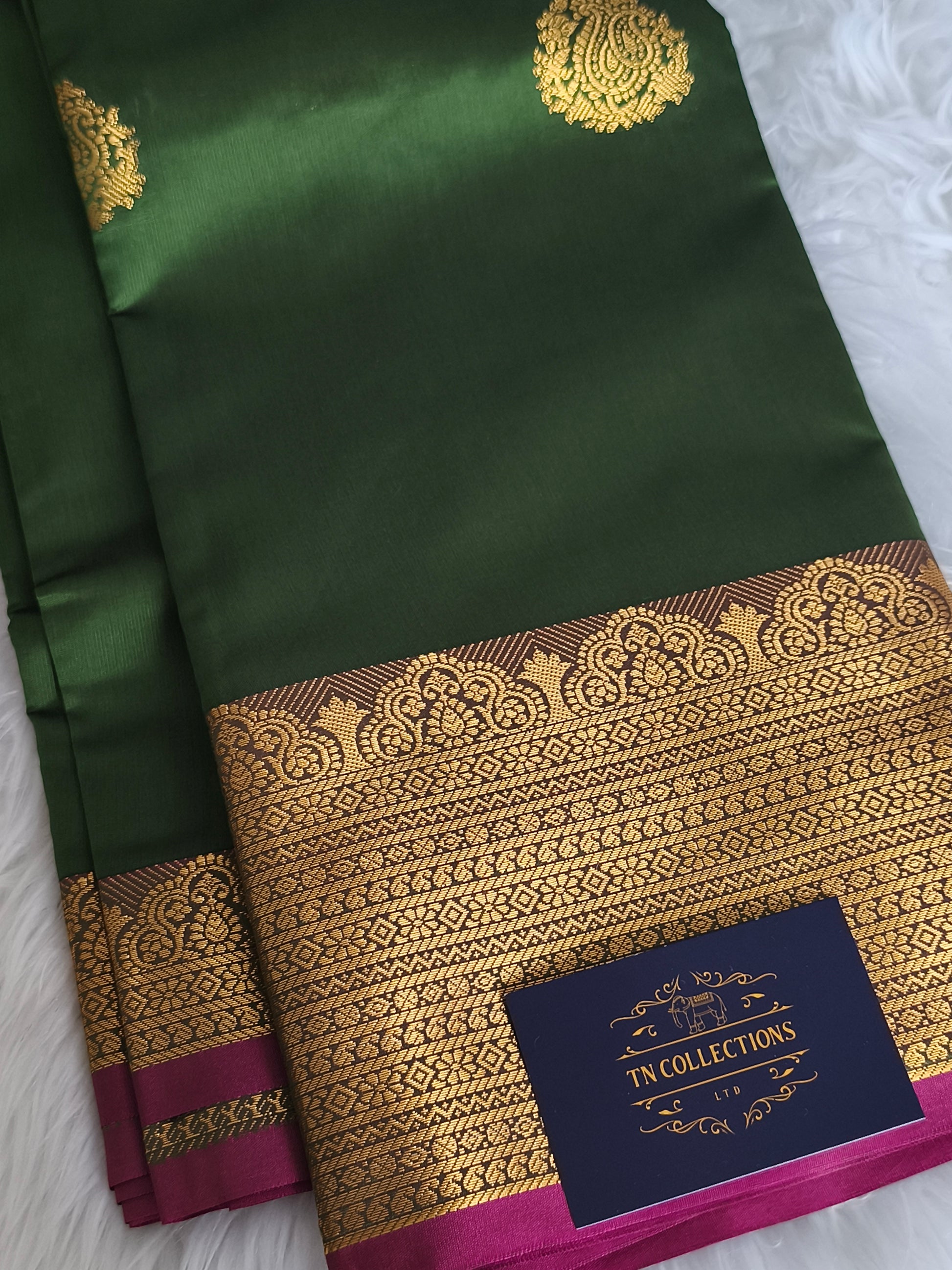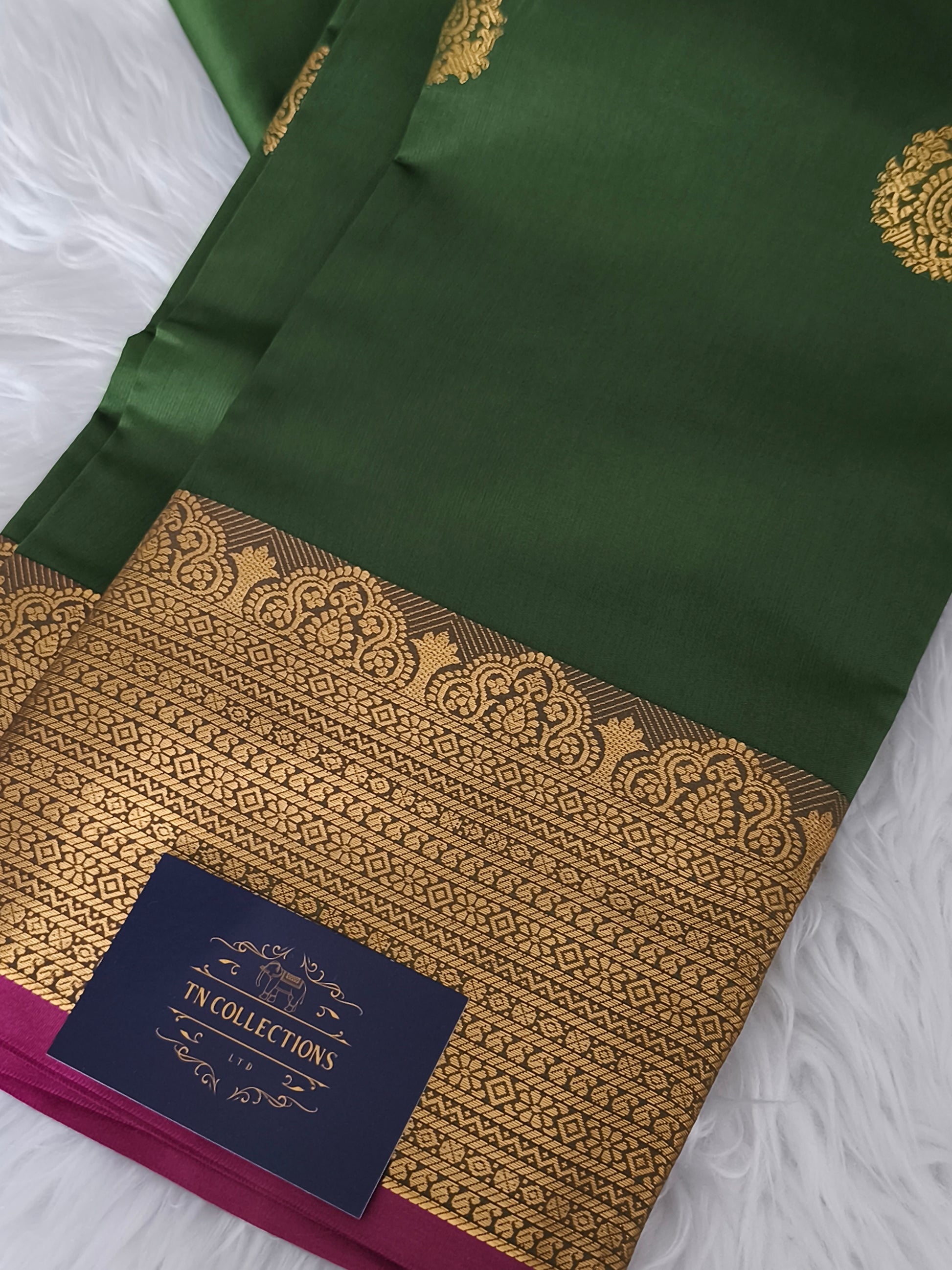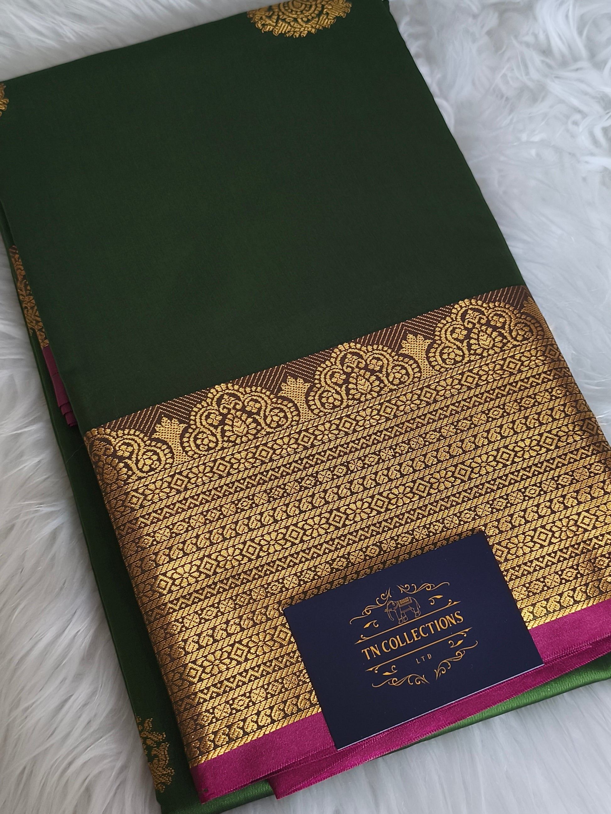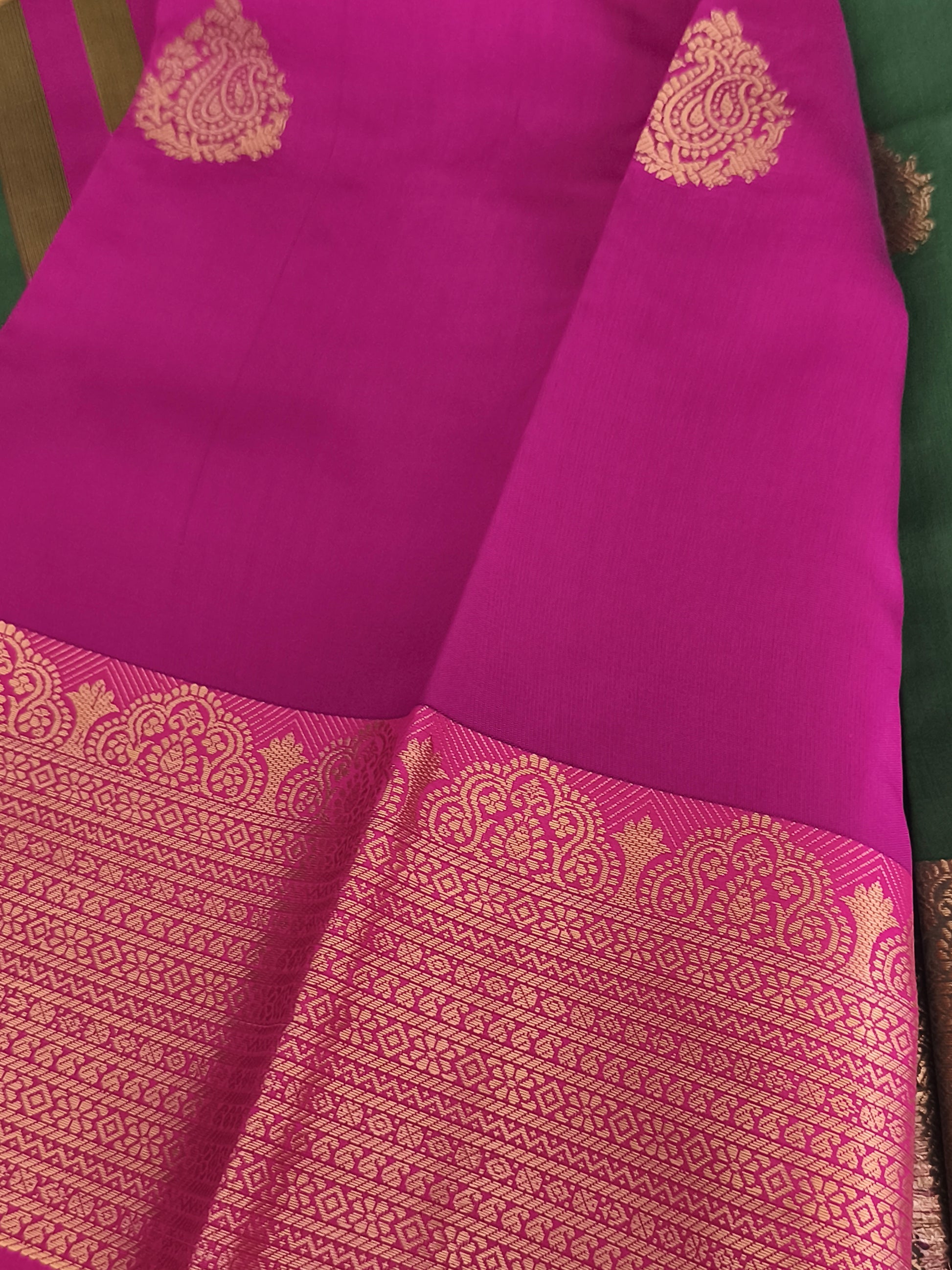 Beautiful trendy kanchi Semi soft silk saree with contrast blouse and rich pallu.