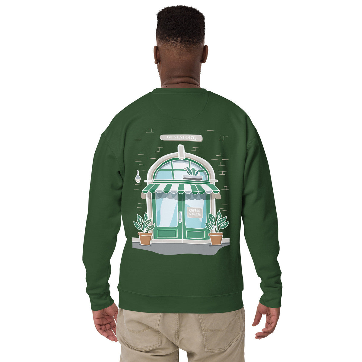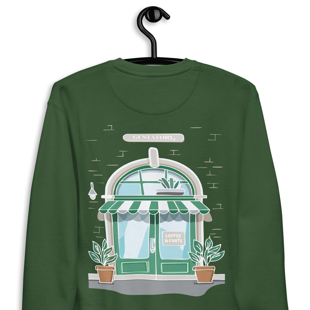 - Coloured GUSTATORY cafe frontage with plants and over-hanging canvas motif on back with matching embroidered GUSTATORY logo and collaboration inside label. Conversations are had over coffee and coffee is perfect for conversation. Meet up with pals or family, even meet new strangers, all are welcome...
