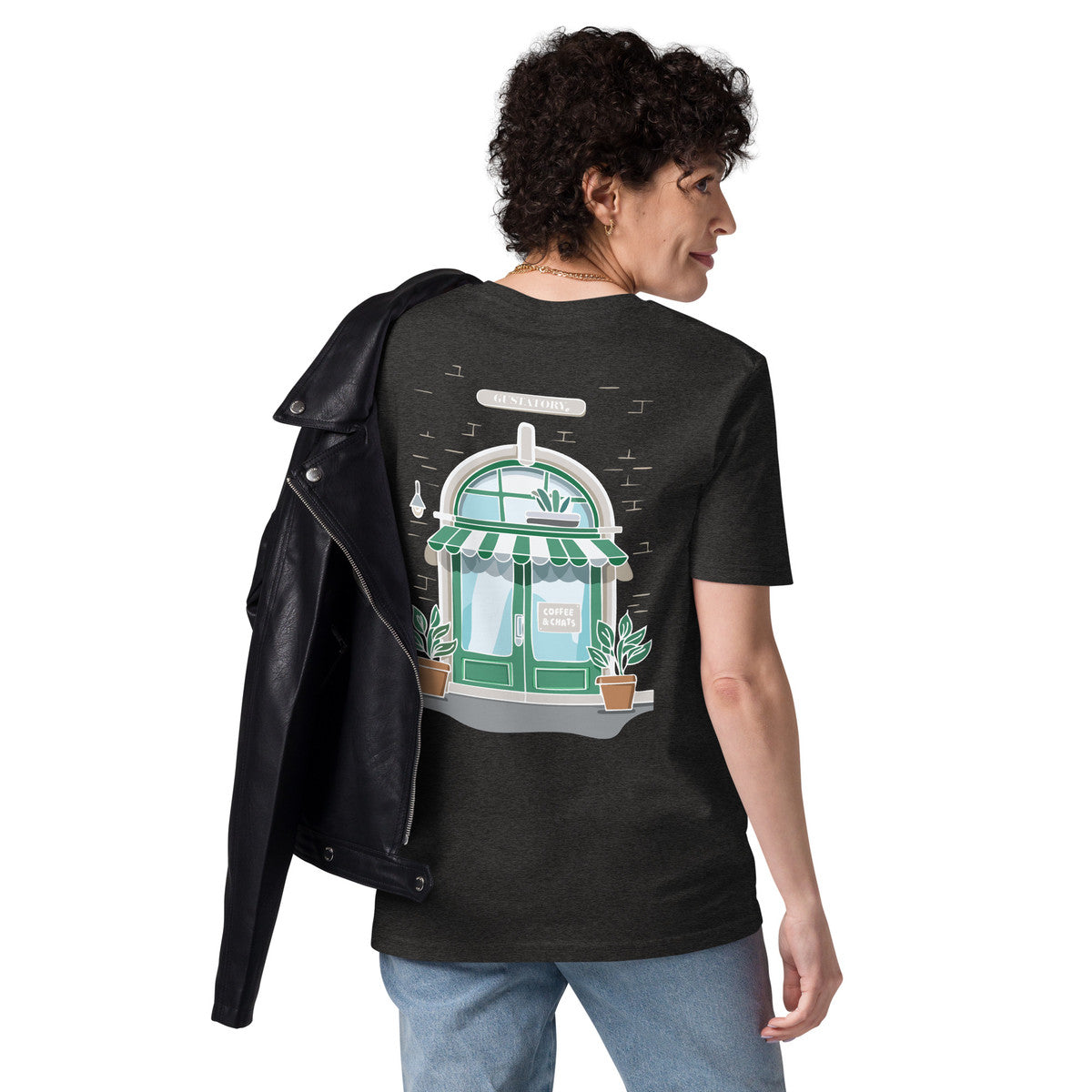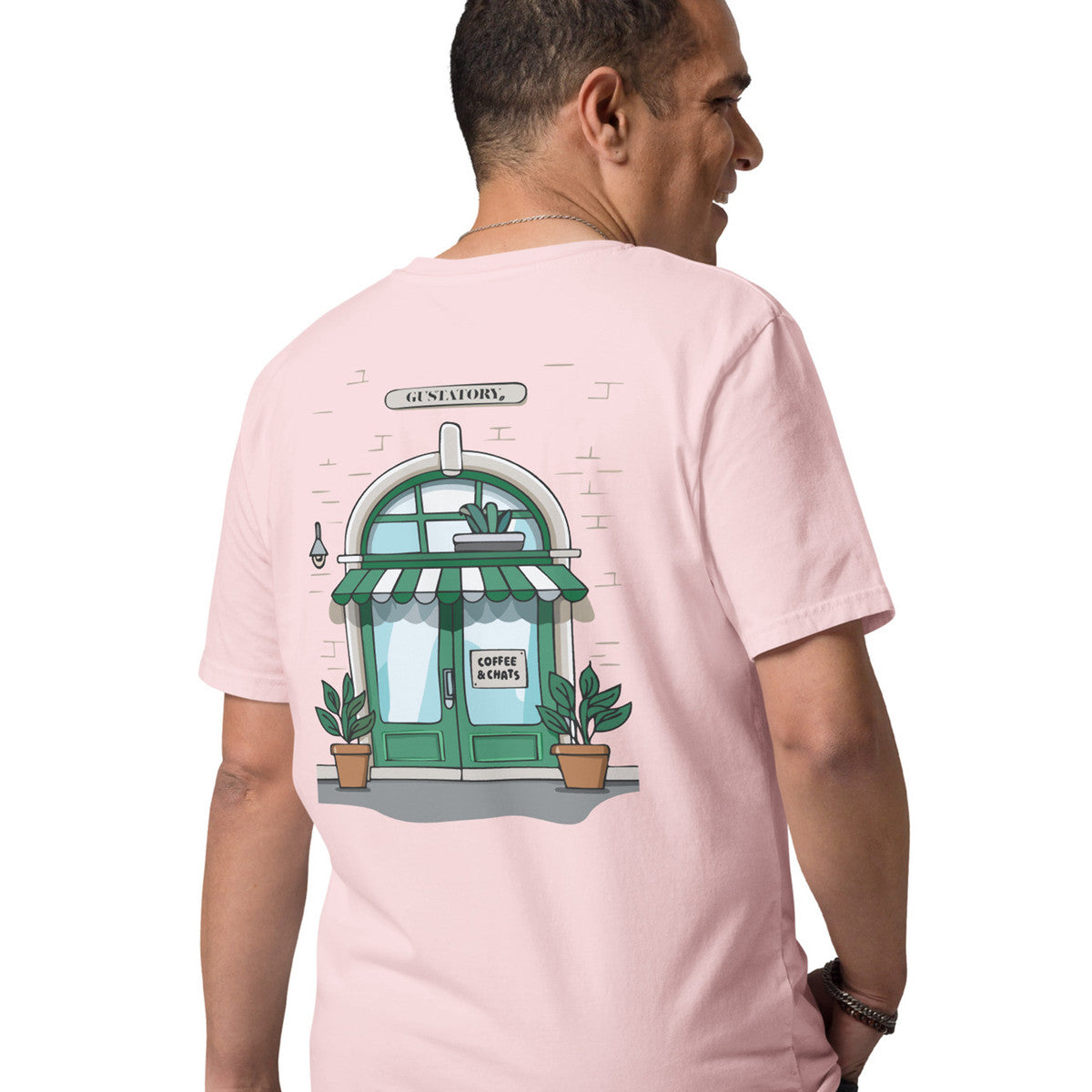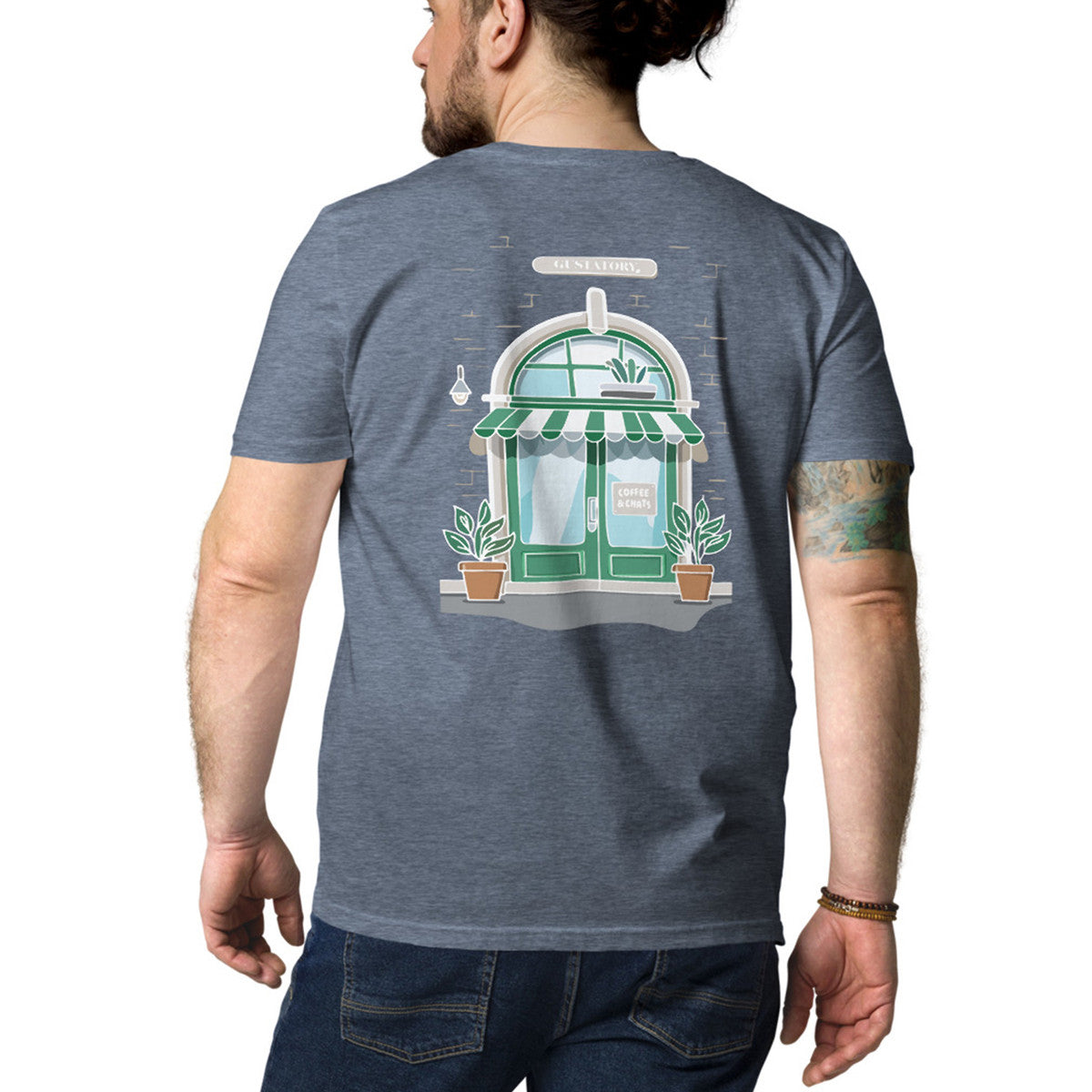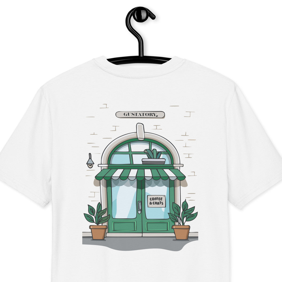 - Coloured GUSTATORY cafe frontage with plants and over-hanging canvas motif on back with matching embroidered GUSTATORY logo and collaboration inside label. Conversations are had over coffee and coffee is perfect for conversation. Meet up with pals or family, even meet new strangers, all are welcome...