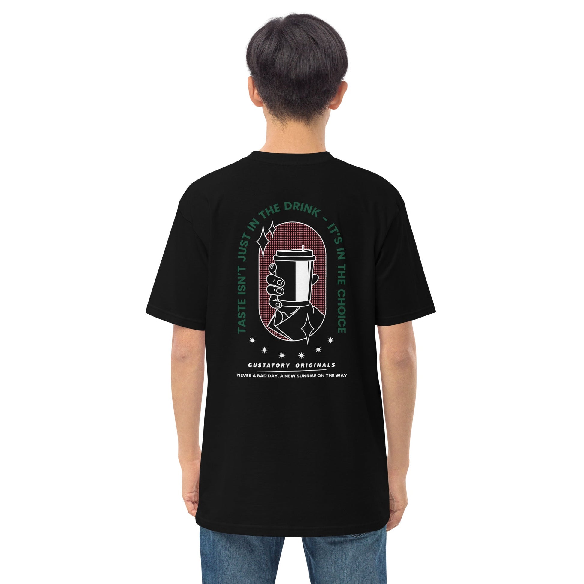 - Coloured takeout beverage and "Taste isn't just in the drink - it's in the choice" motif on back with matching embroidered text and GUSTATORY Originals logo, and collaboration inside label. Never a bad day, a new sunrise on the way...