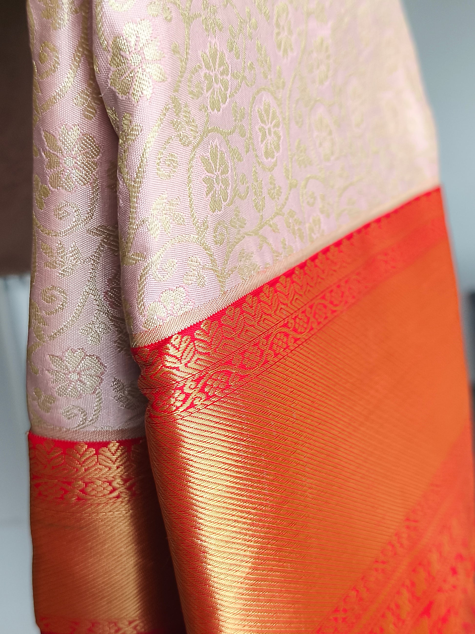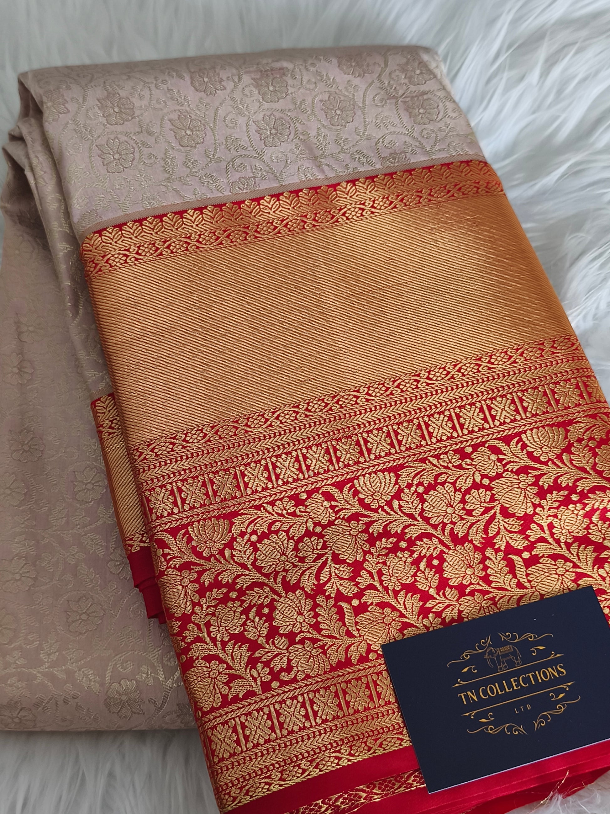 Stunning Traditional unique colour combination Semi kanchipuram silk saree with contrast blouse material and rich pallu.