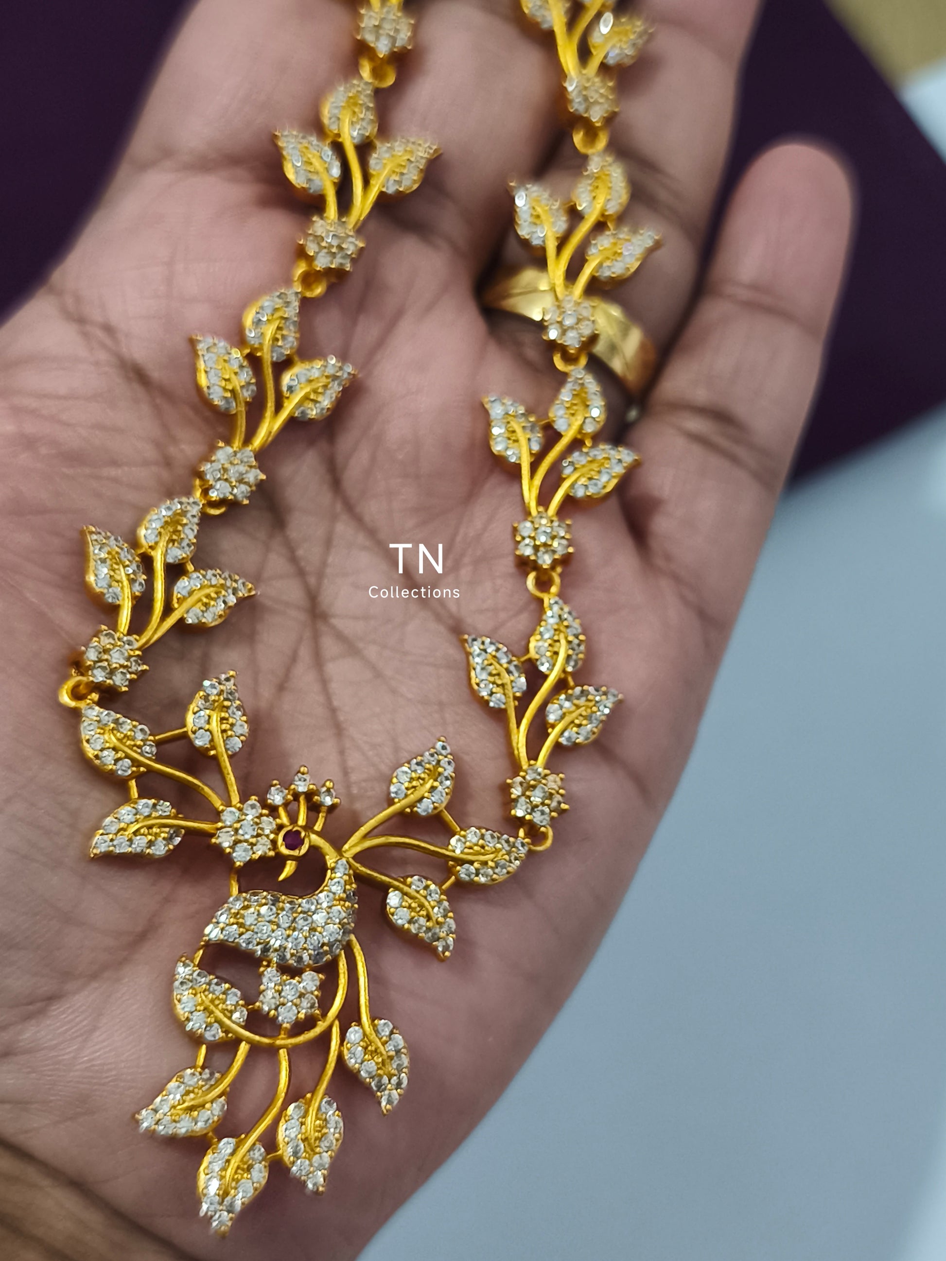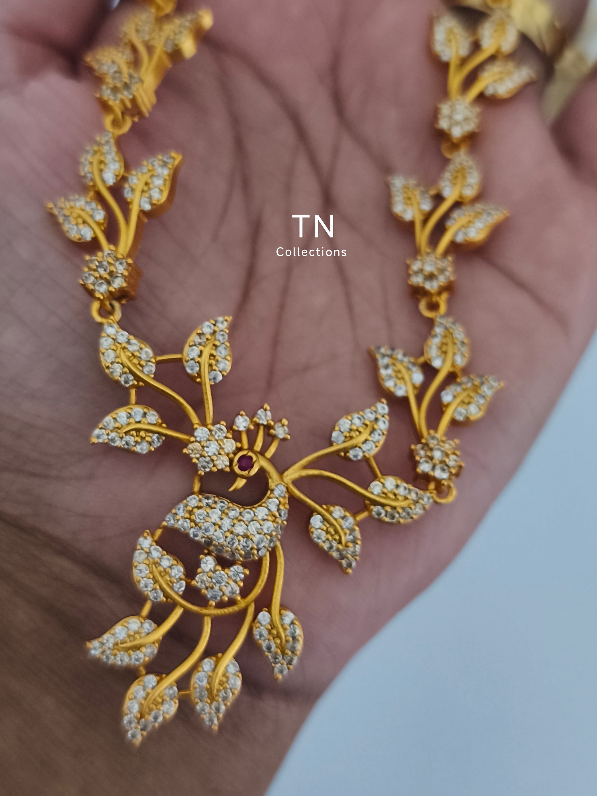 Peacock design full white stones Gold Finish Necklace with Earrings.