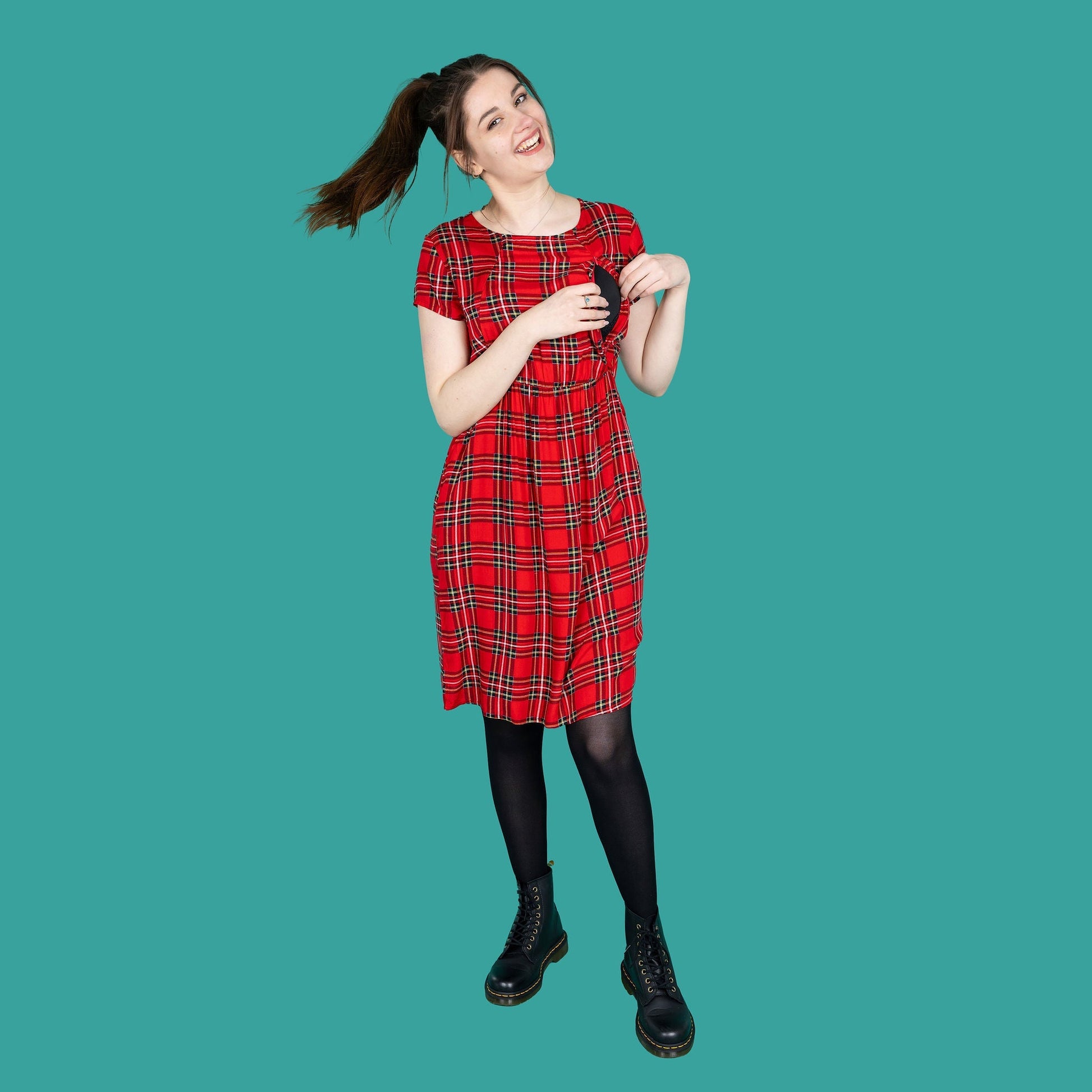The Knee Length Breastfeeding Dress - Red Tartan Cotton