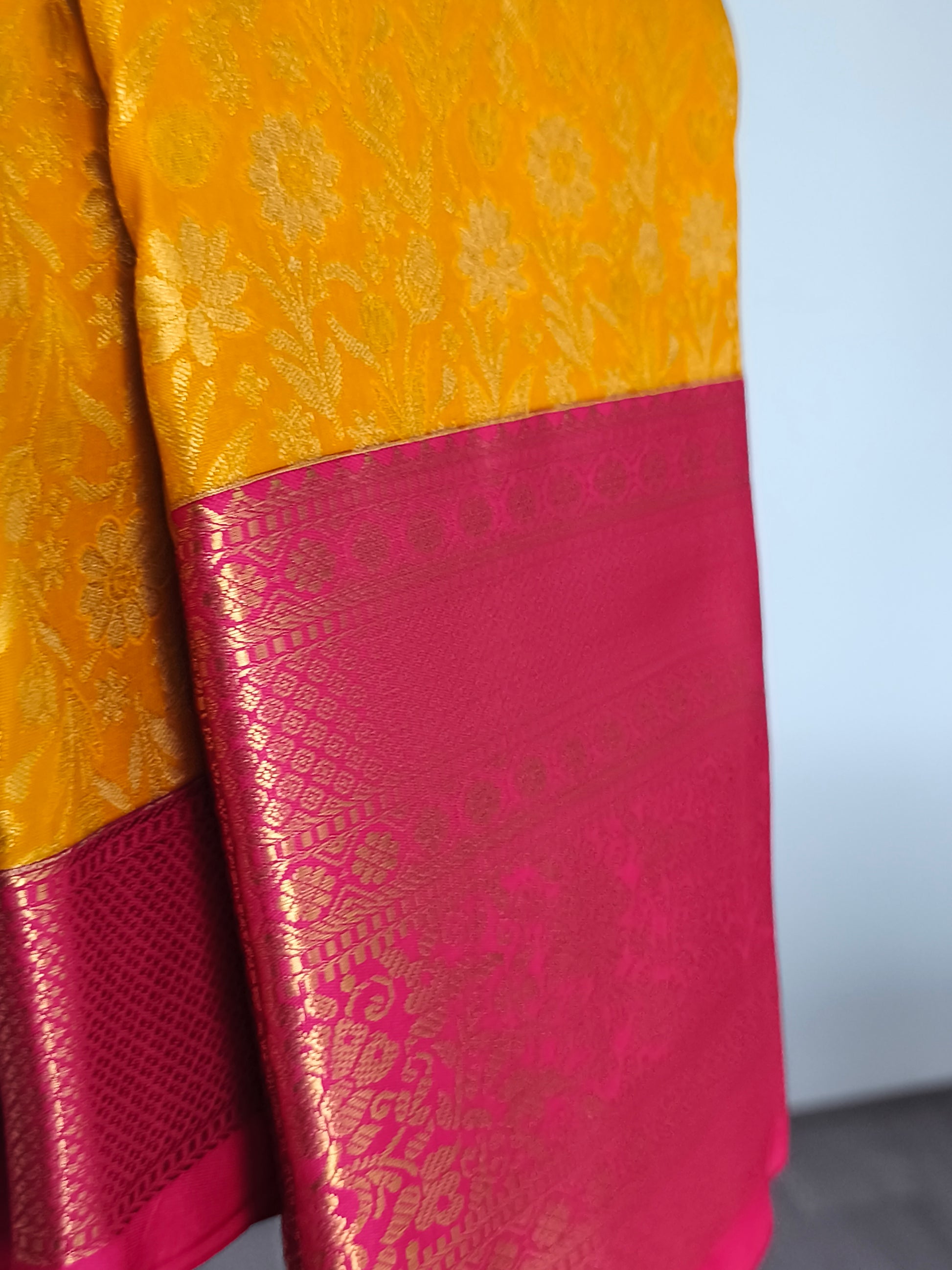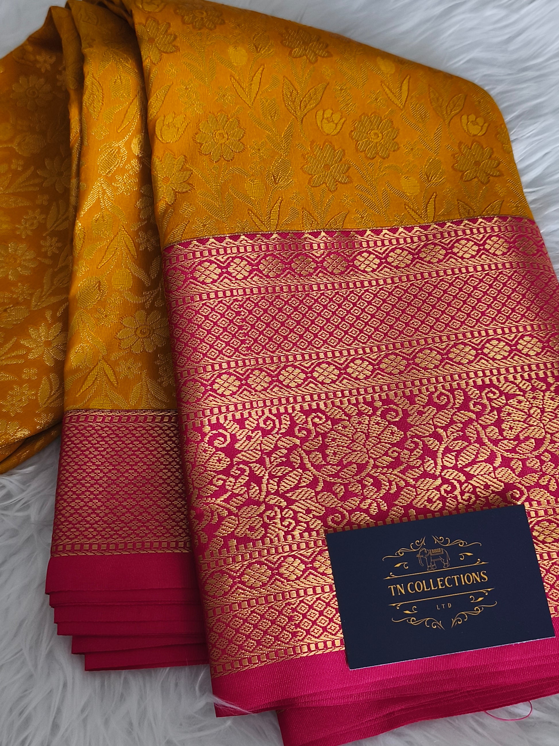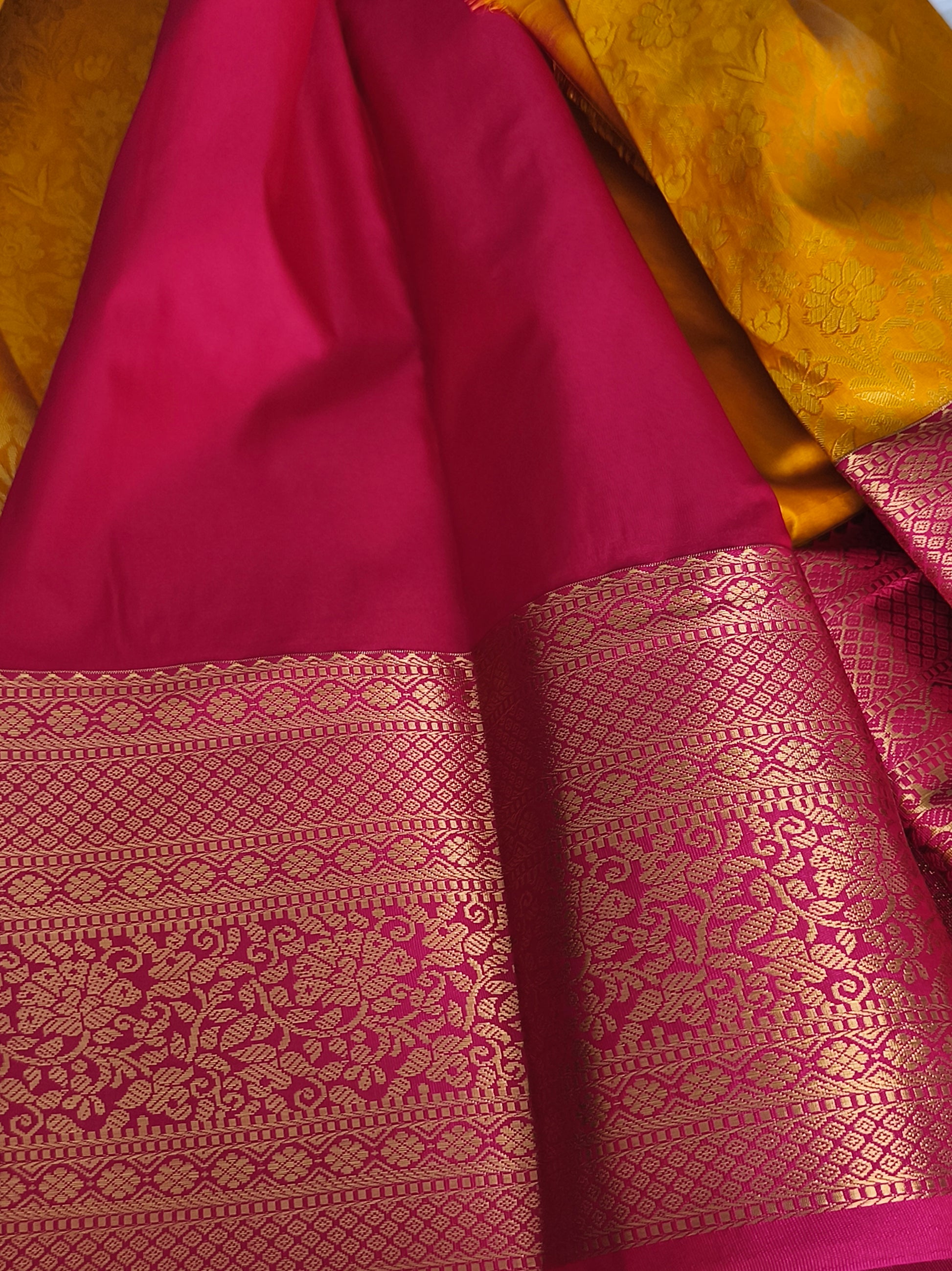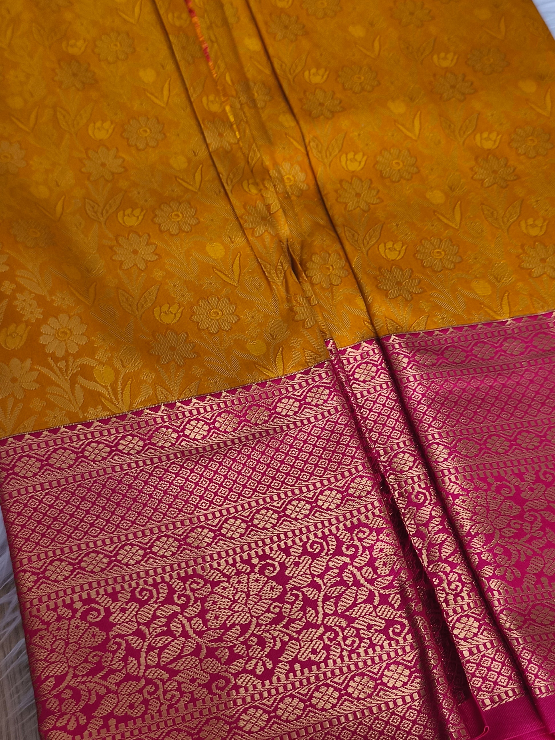 Semi kanchipuram silk saree with contrast running blouse material and rich pallu